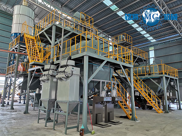該套生產線在全自動干粉砂漿生產線的基礎上,增配針對玻化微珠物理特性專門研制的離心式滾筒混合機及高效專用體積打包機(敞口包裝機可選)。該套生產線效率高、產量大、適用性強、操作性好。該套設備實現多點除塵處理,工作環境好,有力保障員工身心健康,創造高效清潔的生產環境。