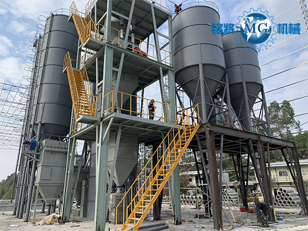 年產(chǎn)10萬噸全自動干混砂漿設(shè)備摒棄傳統(tǒng)地面配料形式,采用塔式布局頂部配料模式,大幅減少物料配比輸送時間、提高生產(chǎn)效率、降低生產(chǎn)成本。混合系統(tǒng)根據(jù)產(chǎn)量要求可選用4m3采用大容量無重力雙軸高效混合機,混合時間短,混合精度高,全套設(shè)備由PLC自動控制系統(tǒng)實時控制,自動化管理程度高,工況環(huán)境友好。是實現(xiàn)高效生產(chǎn)、綠色生產(chǎn)、健康生產(chǎn)、智能生產(chǎn)的理想選擇。