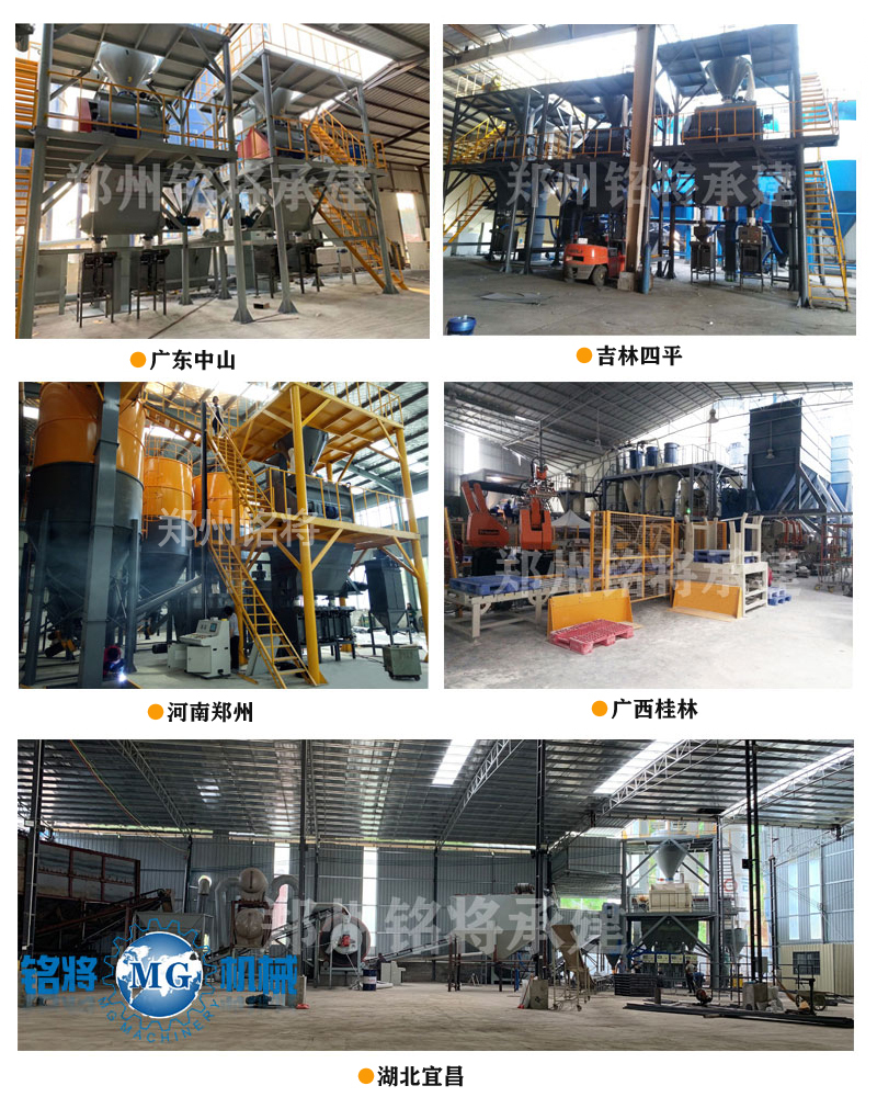 該生產線主要由原料儲存系統、配料稱重系統、輸送系統、混合系統、氣相平衡系統、包裝系統及除塵系統構成。主控制系統依據選定工藝配方下達生產指令,系統自動從儲料倉中按配比提取原料,原料經配重后依次進入待混倉及無重力高效混合機,實現快速混合作業(3-5分鐘)。達到混合精度要求后,成品砂漿被輸送至具備二次混合功能的成品倉,進入自動包裝系統,大大提高產出效率。